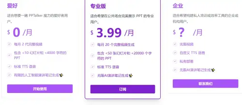 提供从爱好(每月2个视频,<10张幻灯片)到专业(每月20个视频,<50张幻灯片)和企业选项的不同付费功能。