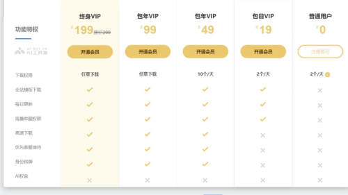 - 包年VIP:¥49。全站模版下载10个/天;享包日会员所有功能。